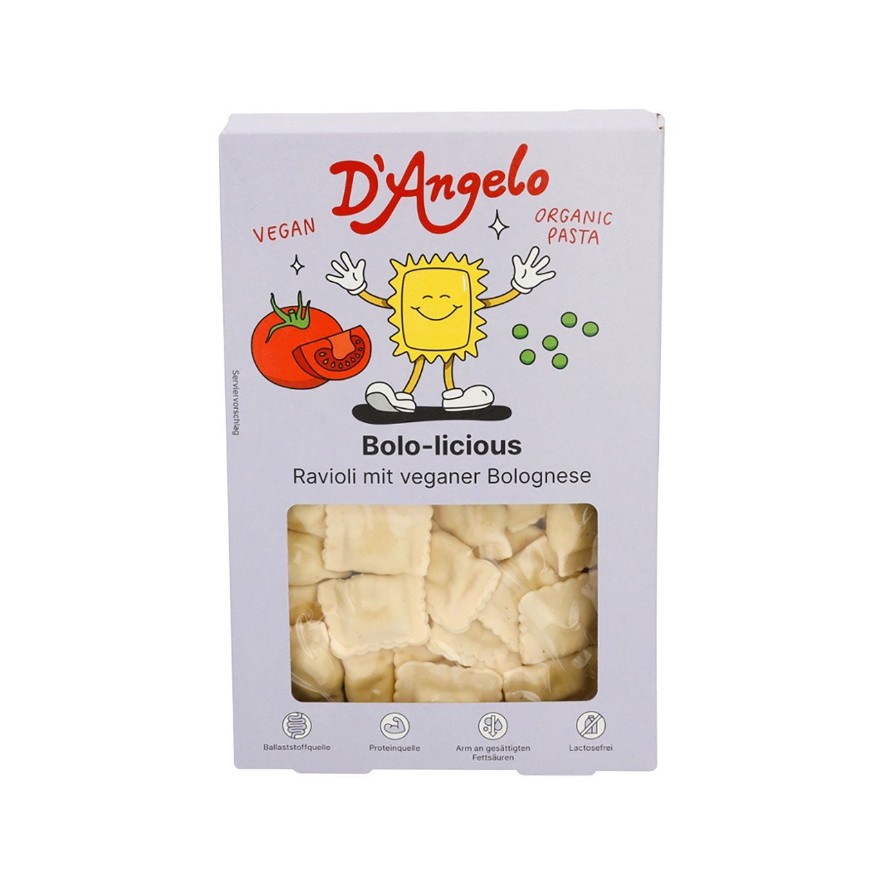 Die tollen Pasta-Varianten von D’Angelo haben uns schon lange überzeugt. Sie sind alle ungekühlt lange haltbar, immer parat, wenn es mal schnell gehen soll und sie schmecken richtig lecker. Nun bekommt unser Pastavorrat Zuwachs. Die leckeren Ravioli sind mit einer feinen veganen Bolognese gefüllt. Anstelle von herkömmlichem Hackfleisch kommen Erbsen und Fava Bohnen zum Einsatz.