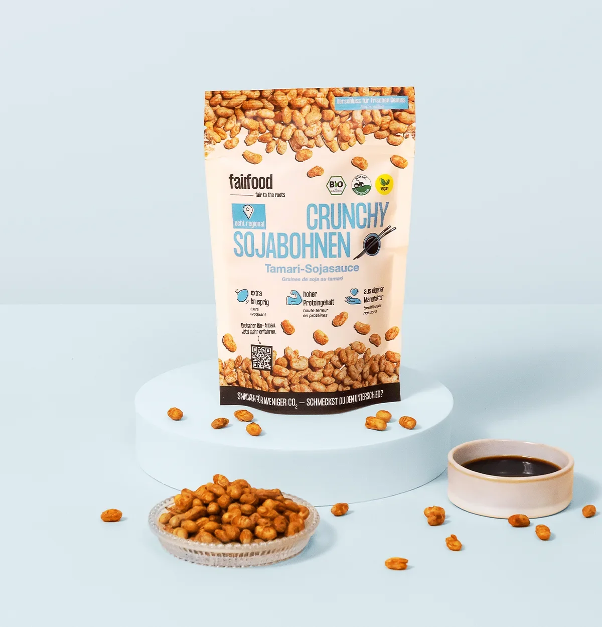 Bio-Sojabohnen aus deutschem Anbau kommen direkt vom Feld zur Rösterei wo sie zusammen mit fein würziger Tamari-Sojasauce ohne Öl geröstet werden.
