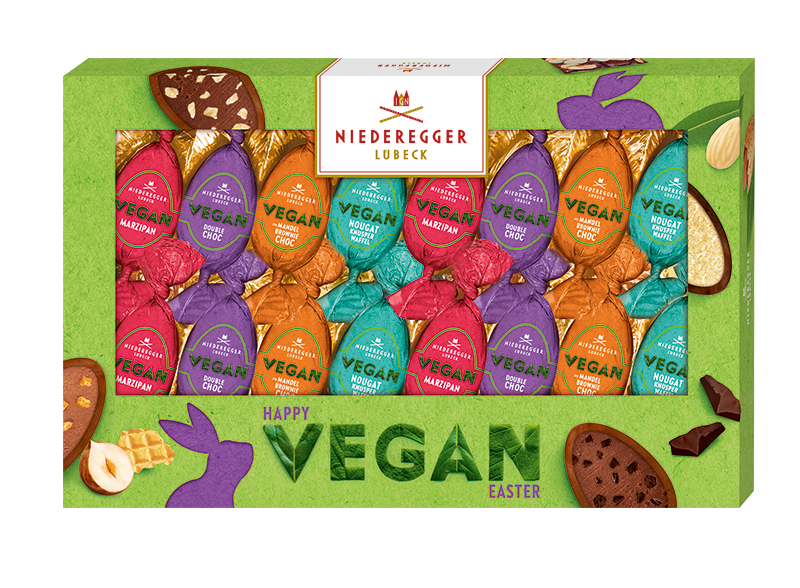 Die schöne Schachtel von Niederegger enthält gleich 4 köstliche Sorten Schokoladeneier: Marzipan, Nougat-Knusperwaffel, Mandel-Brownie-Choc, Double Choc.
